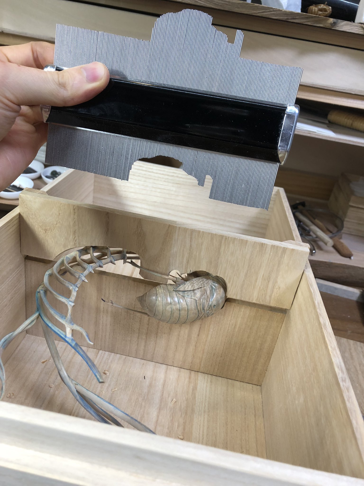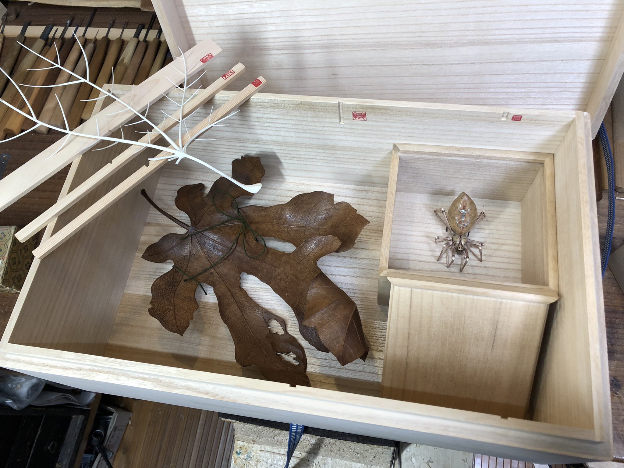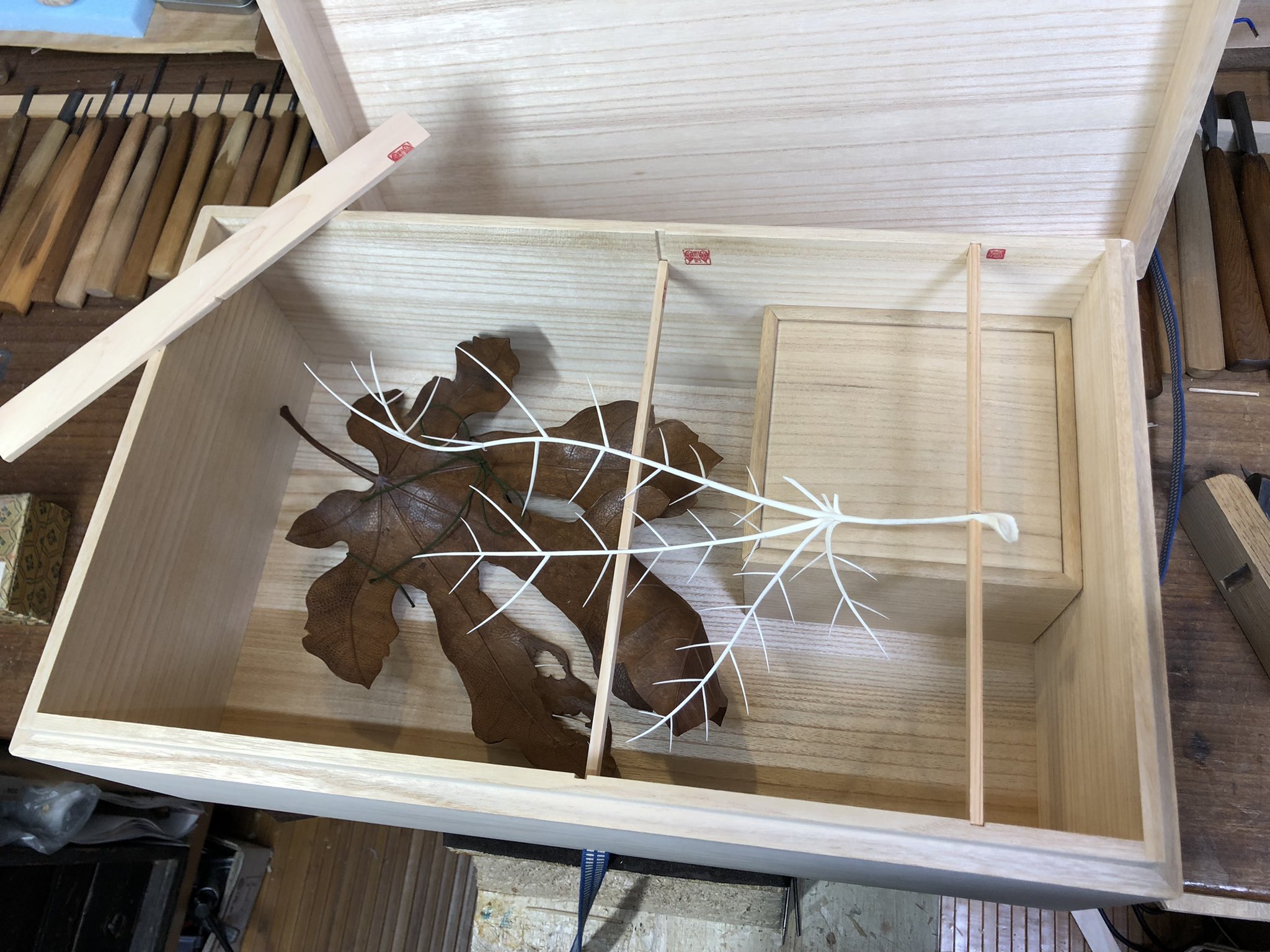 ちょっと分かりにくくて申し訳ないのですけど、他の作品も。。葉っぱは紐で結んで固定出来ます。輸送の際には、この桐箱を大きめのダンボールに緩衝材を入れて、落としたりしても衝撃吸収してくれる様な感じにします。 https://t.co/X9Z1yX0Nu5