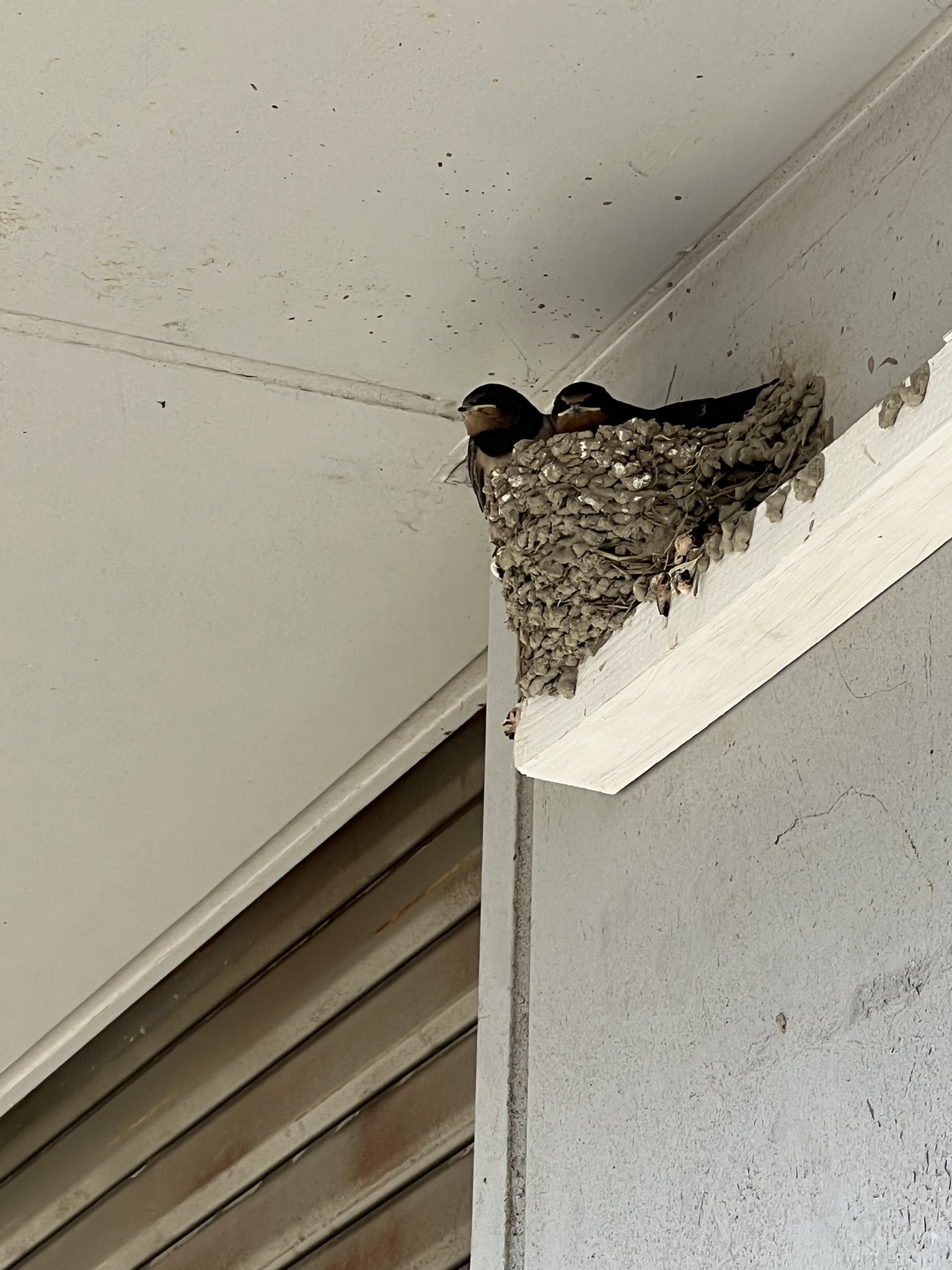 @chibiko_todo 昨年ですが、ぎゅうぎゅうの巣を見かけました♪角に作られた巣なのでこんなW型フォーメーションです(笑) https://t.co/wH11BTADr6