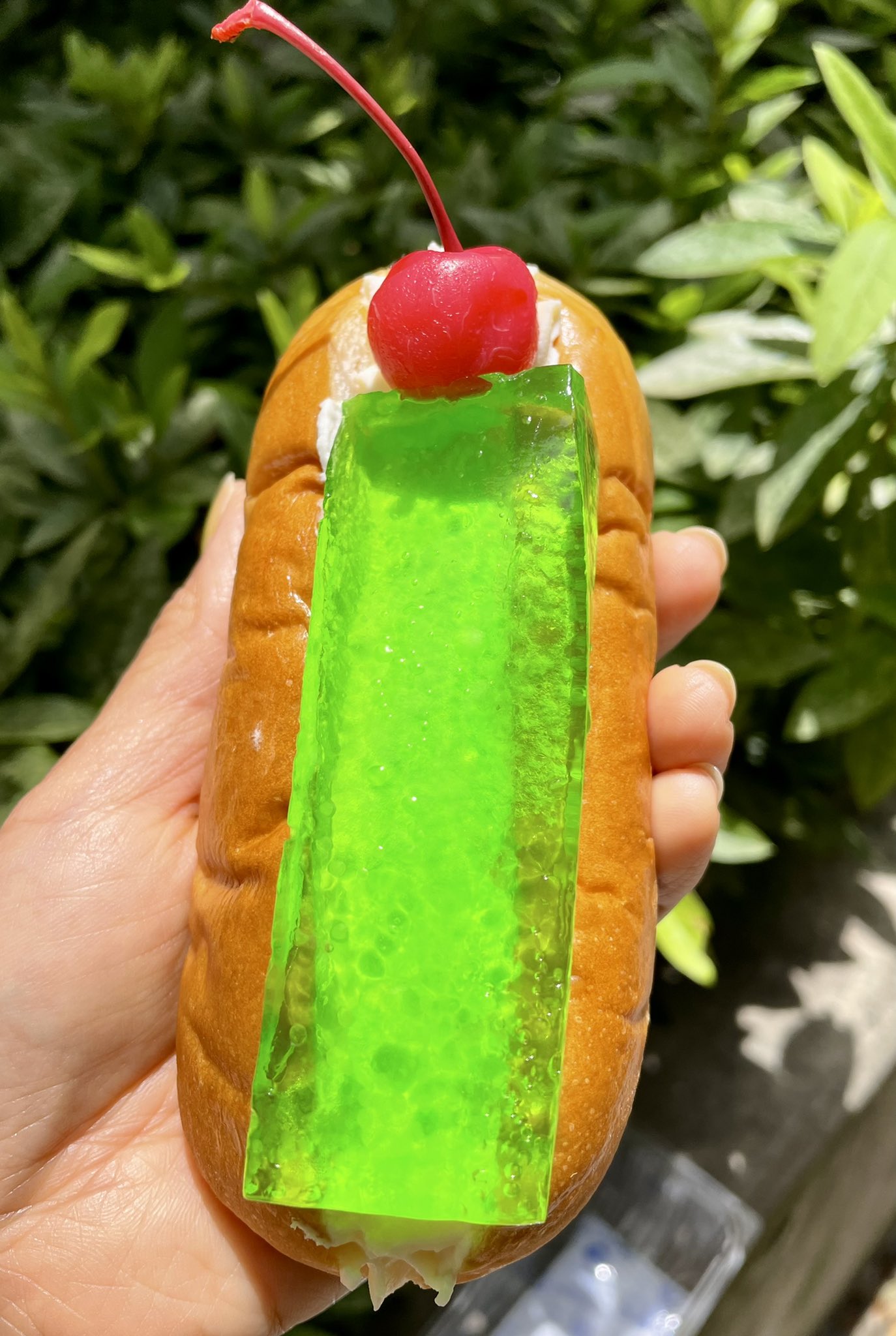 今日は朝から車移動で、やっと会社に戻り帰ろうと東武百貨店を通ったら、気になるパン発見❗️クリームソーダパン(メロン)上の分厚いゼリーに、ホイップに近い生カスタードクリームたっぷり入って、一緒に食べると確かにクリームソーダっぽい味わいに🍈 https://t.co/eXW2yGA3cX