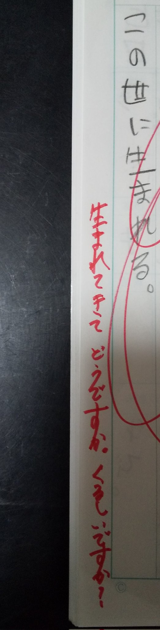 息子の漢字ノートを開いてみた。「世」という漢字を使った作文に対する担任のコメントが衝撃的だった💧息子の作文【この世に生まれる。】担任のコメント『生まれてきてどうですか?くるしいですか?』 https://t.co/74xpGnlDdP