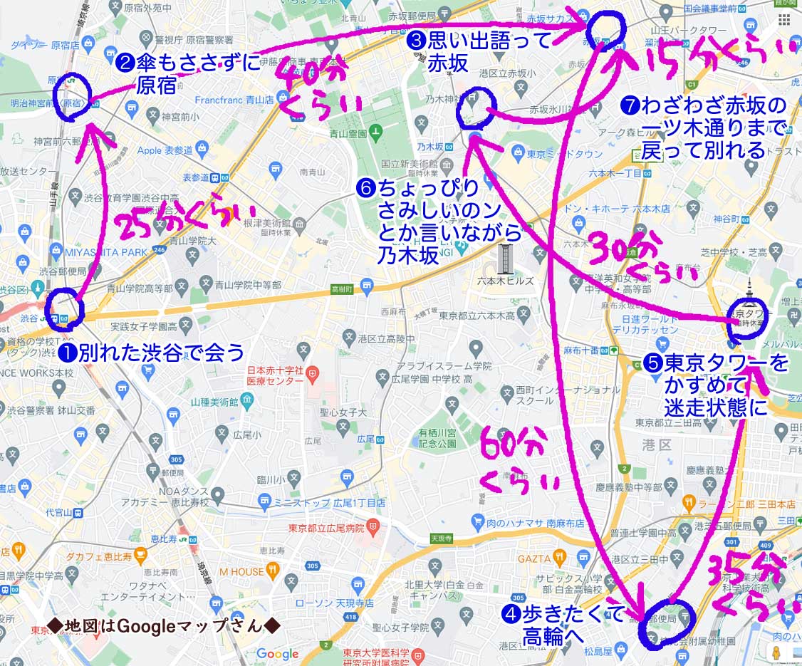 @yumilimi9 口ずさみながら地図上を辿ってみましたが、ほんとコレ別れた人に偶然会って気軽に歩く距離じゃないですね、しかも雨の中…😅この歌 雨の高輪を歩く時、ちょいちょい思い出してた歌なのでかなりツボりました!