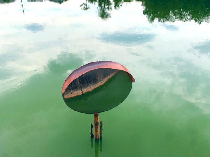 奈良市の八上池には、謎のカーブミラーがある。どこから見ても池の中しか映しておらず、何の為に設置されたのかが不明。これもまた、トマソンと呼べるのでは? https://t.co/AgLNqaW1kK