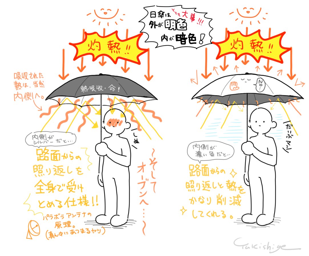 @YKSG_kikuuu @skr_0221 私そういう知識もなく去年外側が白で内側が黒の日傘を買ったのですが、友達にそれめちゃ良い奴じゃん!って言われたのを思い出しました。重宝してます。。。毎年熱中症になるので、今年は気をつけなければ!