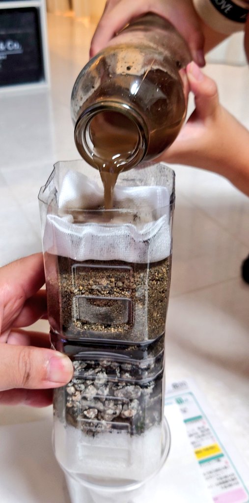 こんな伸びるとは…ろ過装置の中身の順番が上下逆では?というかご質問をよく頂くのですが、実は私も昨日の時点はそう思ってました今回実験にあたりこちらのHPを参考にしていて、そこではこの順番で合ってるようです他にも色々なやり方があるのかもhttps://t.co/rNCJ0wCyq8