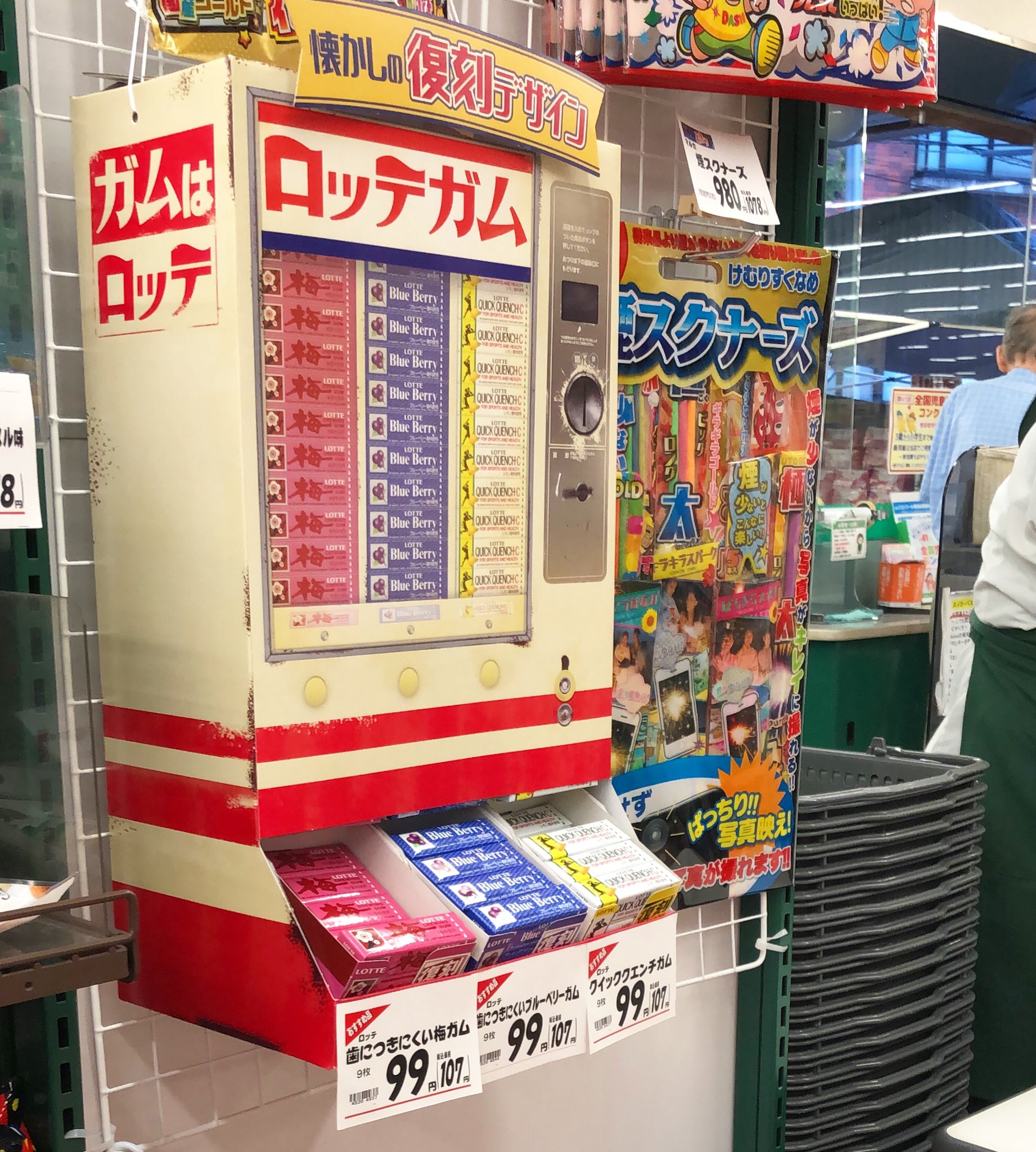 ロッテの復刻ガム専用の販売ケースがめちゃめちゃクオリティ高い! リペアした本物の自販機を設置してるのかと思ったら紙製! 塗装の汚れとか金属部分の摩耗の表現が秀逸! このケースを売ってほしい! あと、イヴとローラの復刻版も! https://t.co/dqb2K26AUu