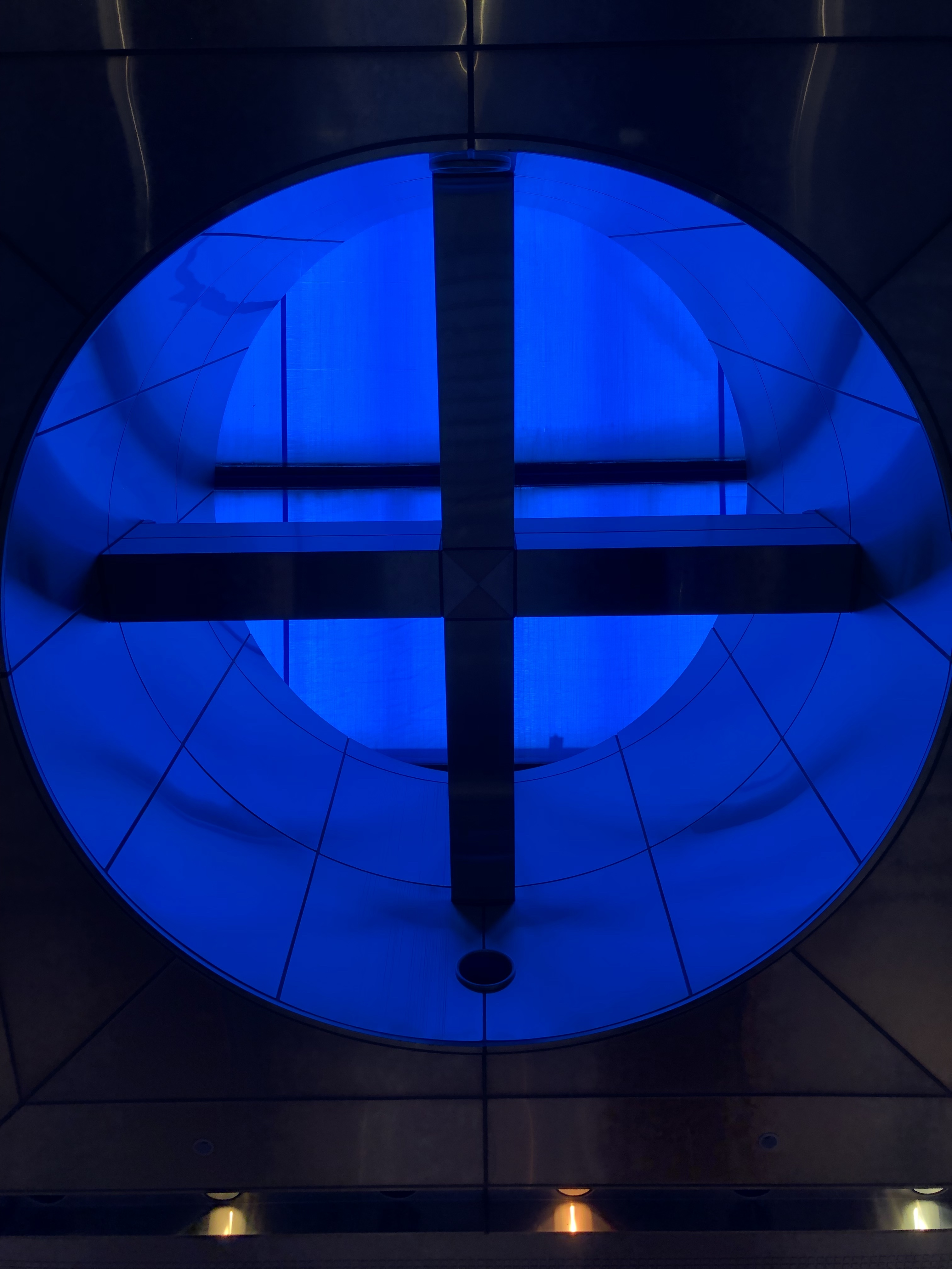 【お知らせ】正直お恥ずかしい話なのでここで告知するか迷いましたが、現在館内トップライト(天窓)付近の補修作業のためブルーシートが貼られ、階段室が青くなっています。あまりに綺麗なので勘違いされそうですが、作品などではありません。補修作業です。ご了承ください。(写真は無加工です) https://t.co/IJ1Pz8OltV