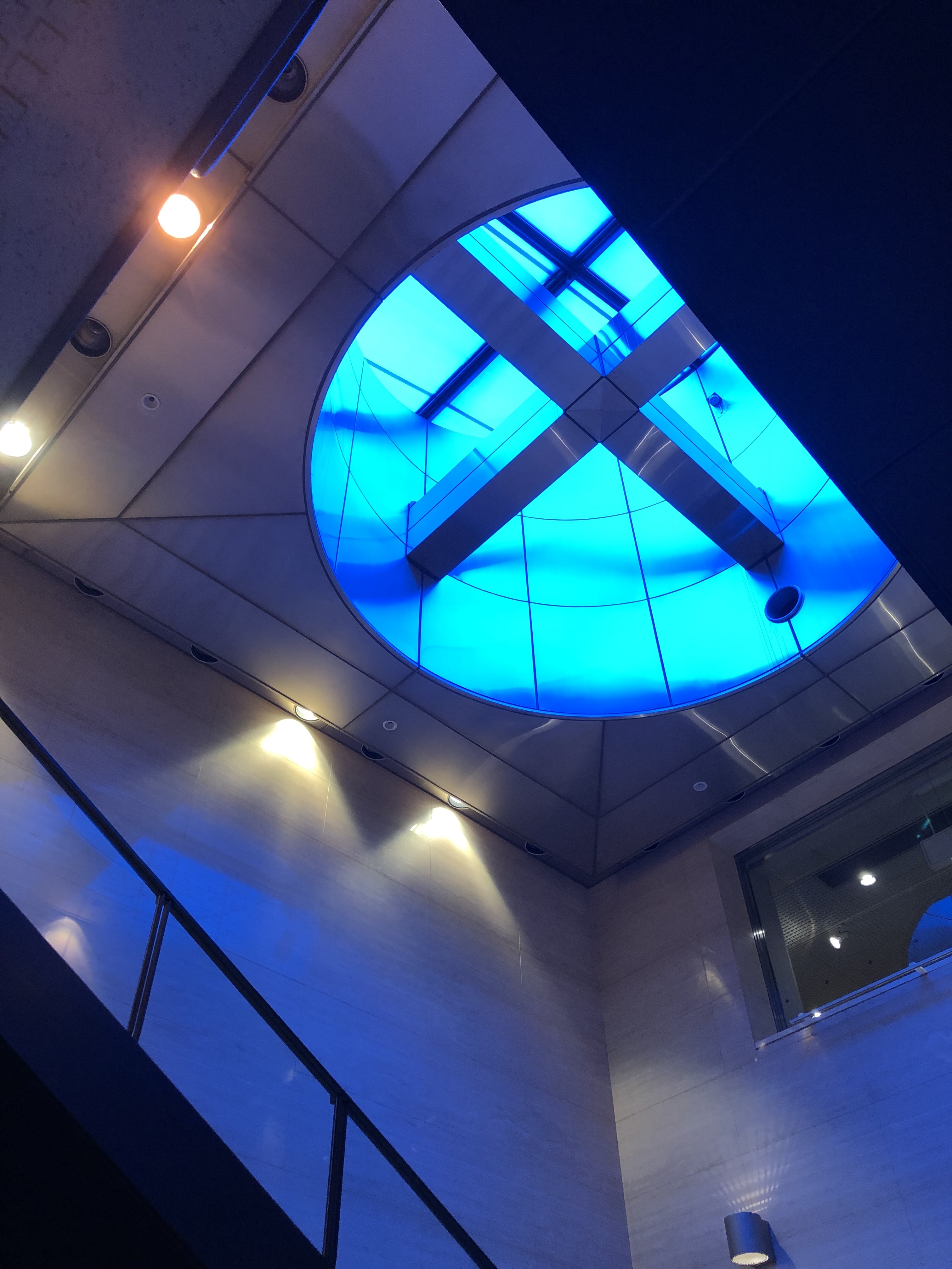 当館もケンビになって早30数年、文化会館から数えて50数年経過します。色々な補修メンテを行いつつ、日々開館しております。これも補修の一環ですので、この綺麗な青も多分一時的なものです。しかしまるで水族館のように見える天窓に、階段の影まで碧く、水銀燈の温かい光の色との対照が綺麗です。。