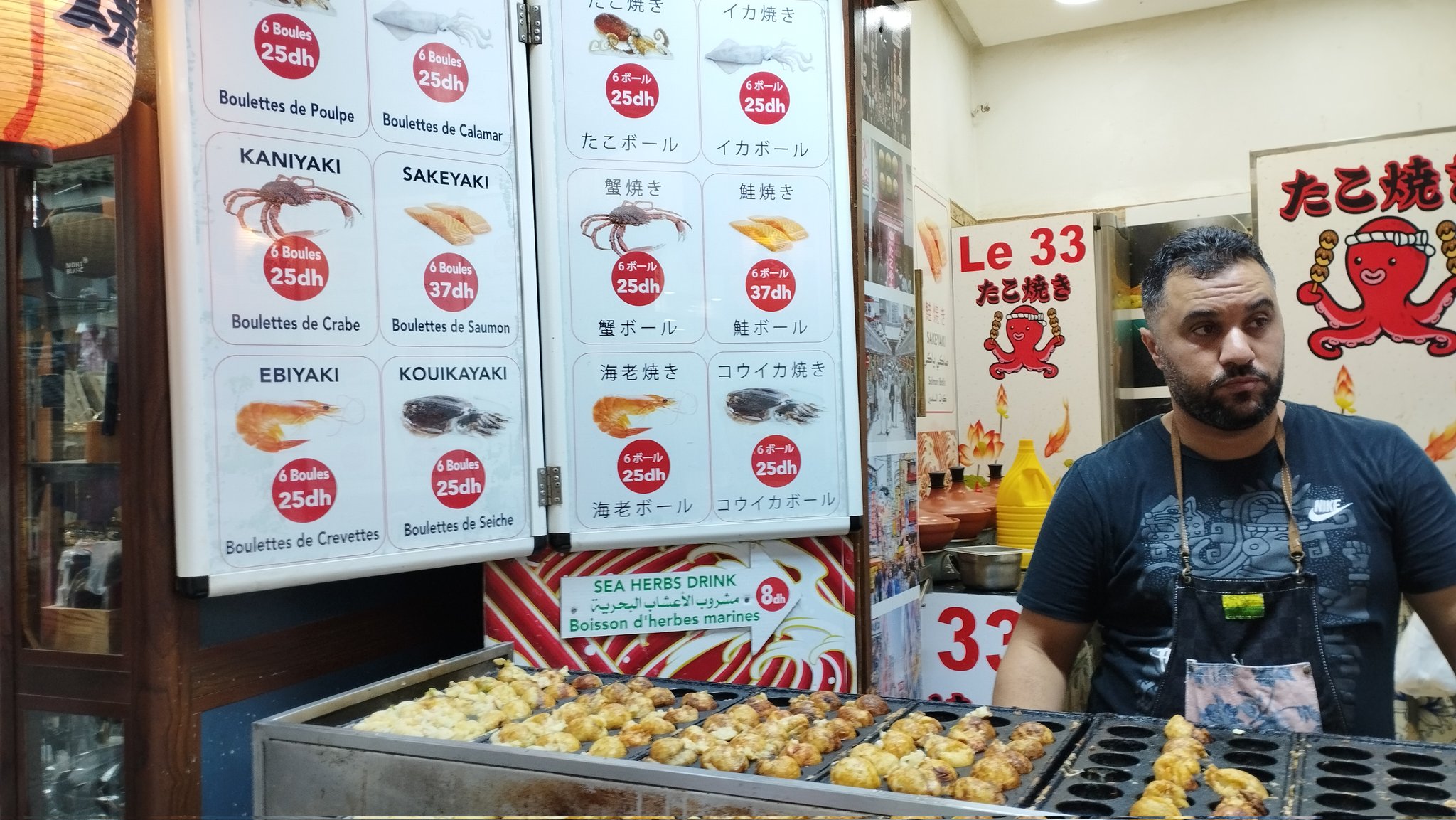まさかのたこ焼き屋発見。日本で売られてるタコも多くはモロッコ産だから、本場といえば本場。たこ焼きを注文したら、「Today no たこ焼き, only エビ焼き and いか焼き」と言われた。モロッコでまさかのエビ焼き体験となった。 https://t.co/wGTcFoScZj