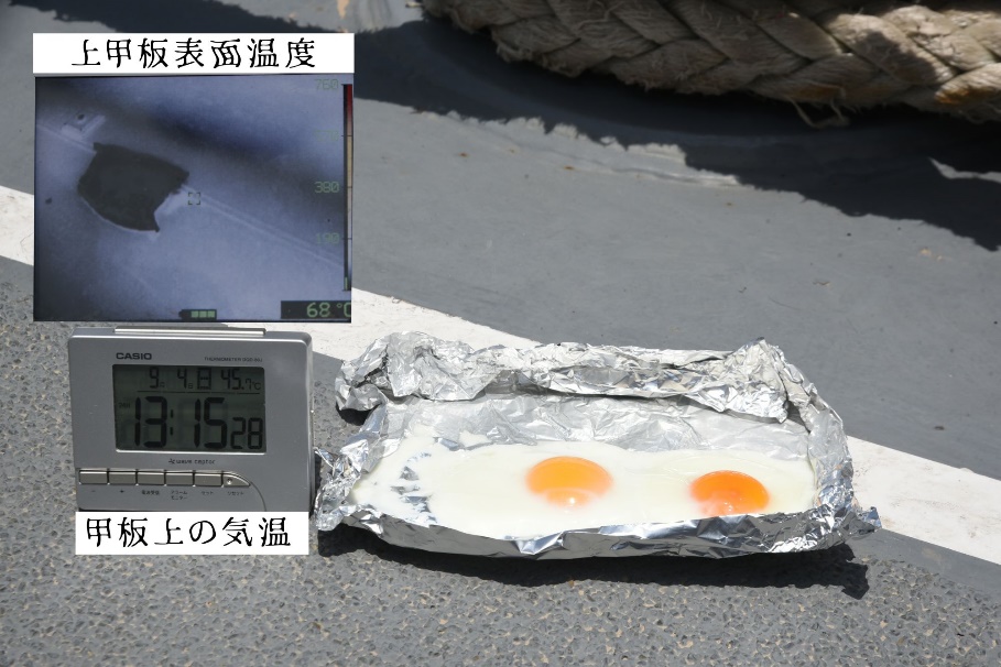 あまりに熱いので、甲板で #目玉焼き🥚 を焼いてみました‼️#護衛艦隊 #はるさめ #海賊対処行動 #気温46度 #甲板表面温度68度 #いい具合に半熟 https://t.co/xpVQEd5ZVd