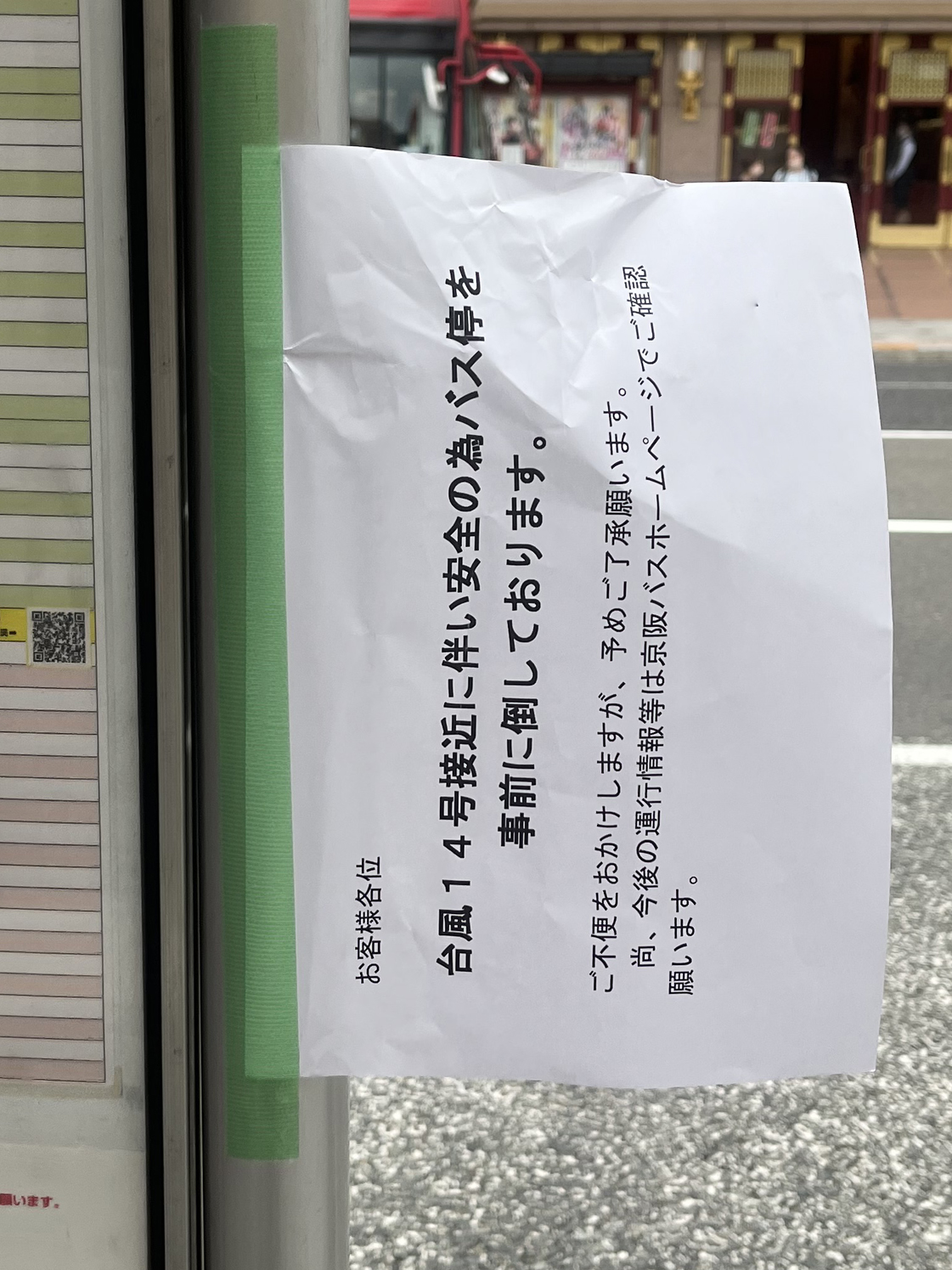 多くの方々が御懸念されますが、”台風接近にともないバス停を倒している”旨、掲示されているのでご安心くださいでも、貼り紙しているのに元に戻されているバス停もあるからバス会社さんは大変なのですどうか、バス停をあらかじめ倒しておく習慣、認知が広がると嬉しく思います https://t.co/9CB3Alm2E4