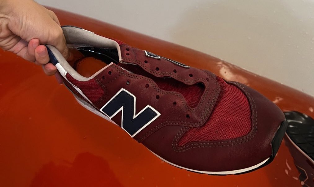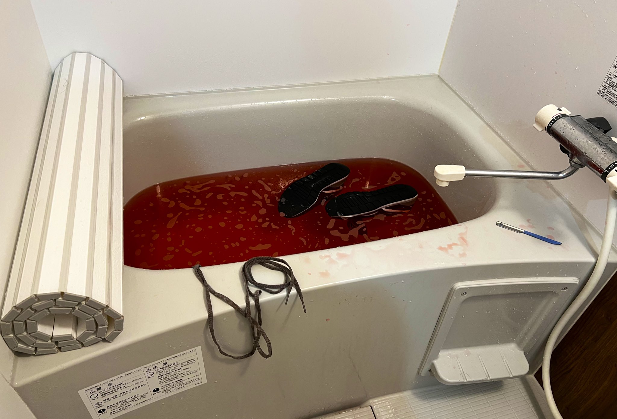 赤いスニーカーをお湯で洗おうとしただけなのに、、、、猟奇殺人の現場みたいになっちゃった、、、、、、 https://t.co/nenvWs9dss