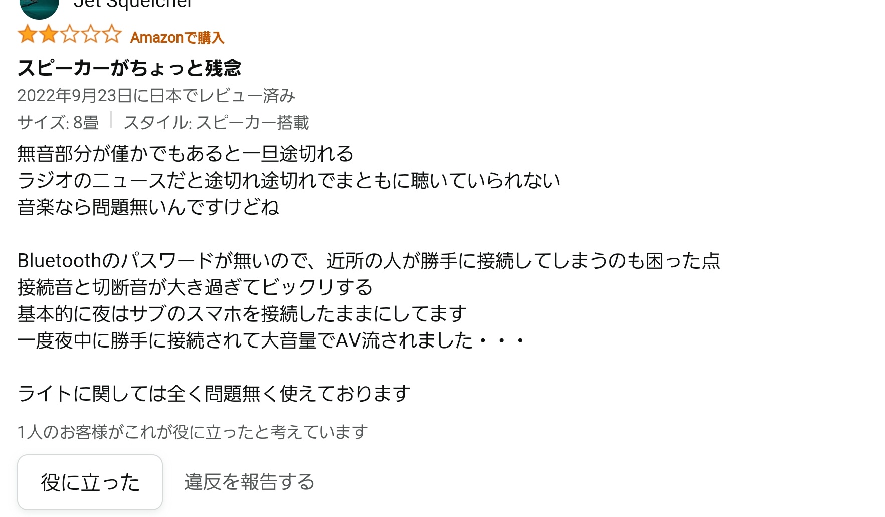 アイリスオーヤマのスピーカー付きシーリングライト。Bluetooth接続スピーカーで天井から音楽を流せると言う品。しかしBluetoothにパスワードがないため、集合住宅だと隣家などから勝手に接続され音楽を流されると言う一品。昨晩寝てる時にやられて、スピーカー外した。こんな不良品発売するなよ… https://t.co/Yd7BC33w8j