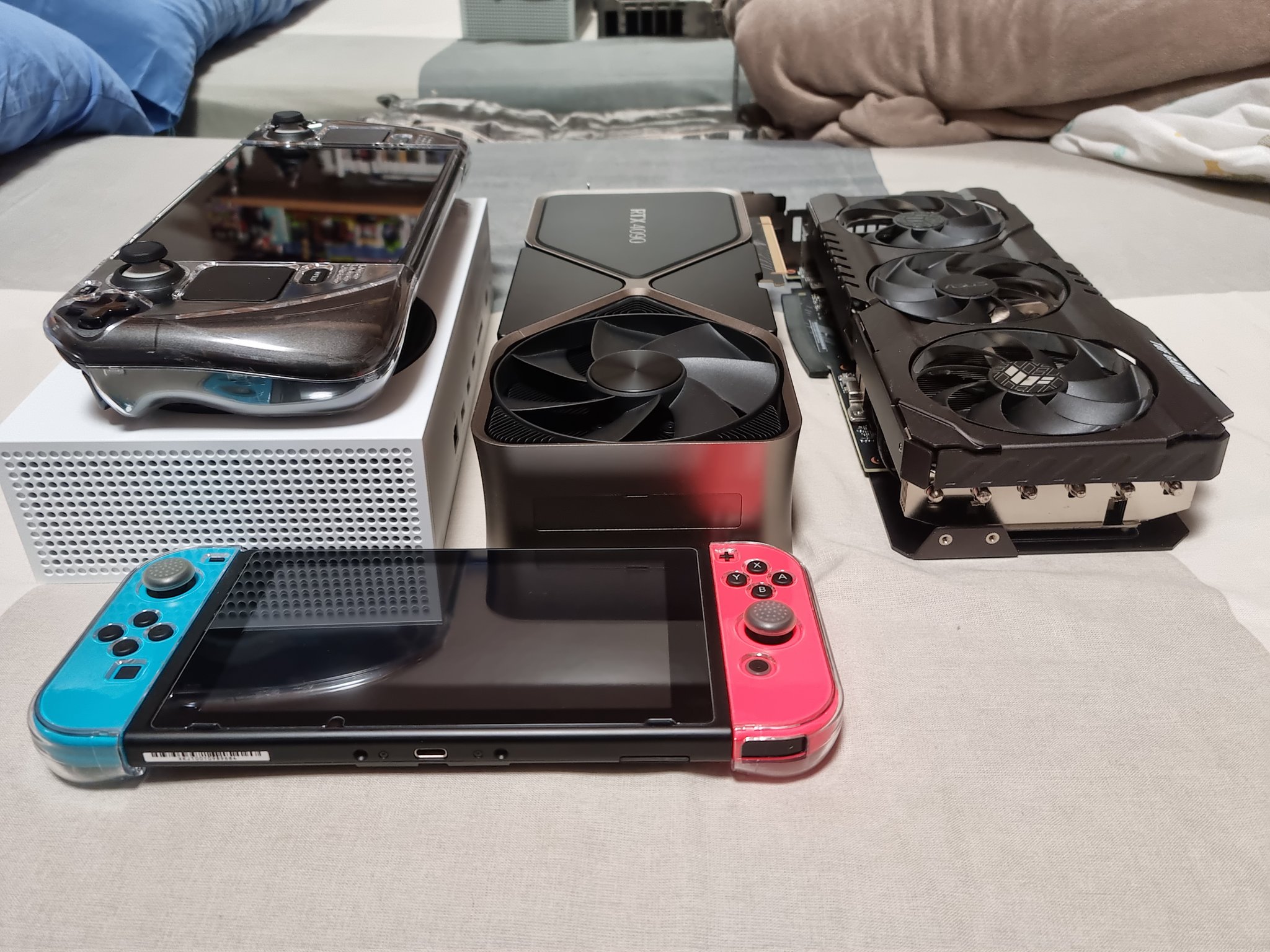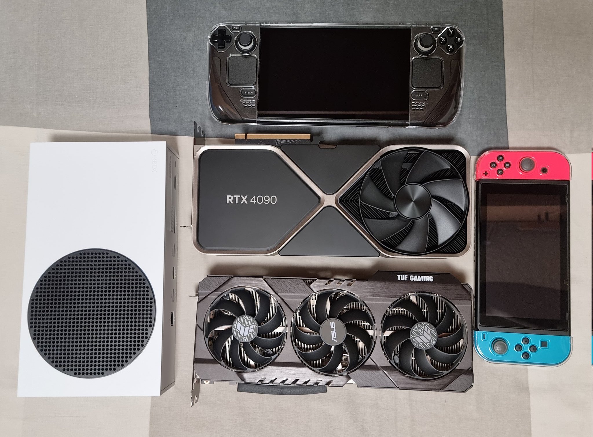 Algunas fotos más de la RTX 4090 comparada con Switch, Steam Deck, RTX 3080 Asus TUF, Series S/X y PS5.Al lado de Steam Deck o PS5 ya no parece tan grande. ¿Verdad? 😂 https://t.co/ubf86rkDvD