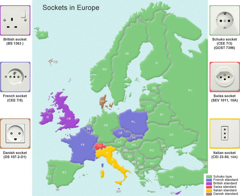 @Moneycantbuytim ソケットの形状は違いますが、イギリス以外Cタイプのコンセントが刺さるそうです。電圧が違うと言っても大体の製品は対応できるので問題にならないのかと