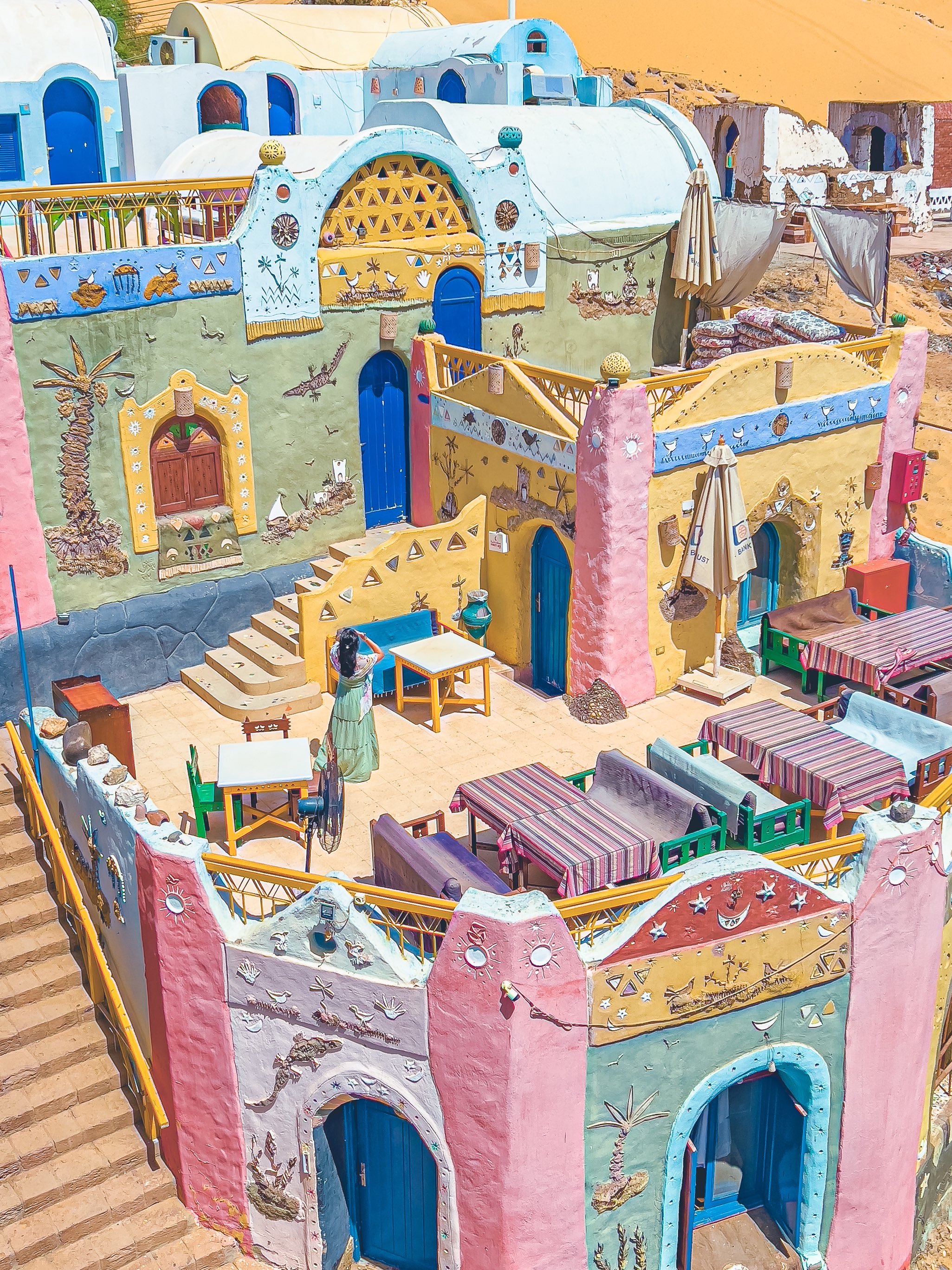 場所はエジプトのアスワンにあるヌビア村です🇪🇬アスワンから南に広がるナイル川流域は古来ヌビアと呼ばれ、オペラのアイーダはこの地の王女として知られています。アスワン中心部からモーターボートで40分前後のヌビアの村には可愛すぎるパステルな世界が広がっていました✨