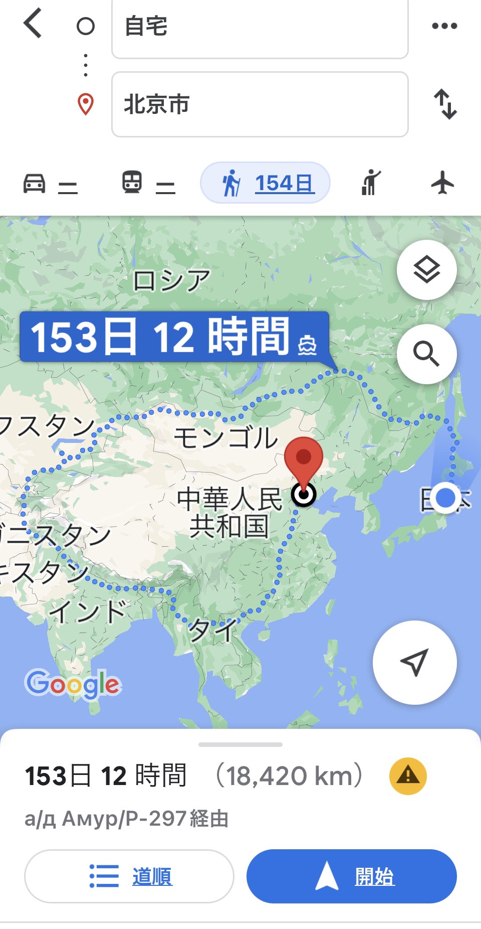 Googleマップ、日本から北京に徒歩でいこうとすると、北方領土経由でロシアに密入国し、アフガニスタンからパキスタン、インドと国境を越えミャンマーの武装ゲリラが潜むジャングルを超えて中国入りするという命がいくつあっても足りないルートを指示してくる https://t.co/XJnW2pM4bw
