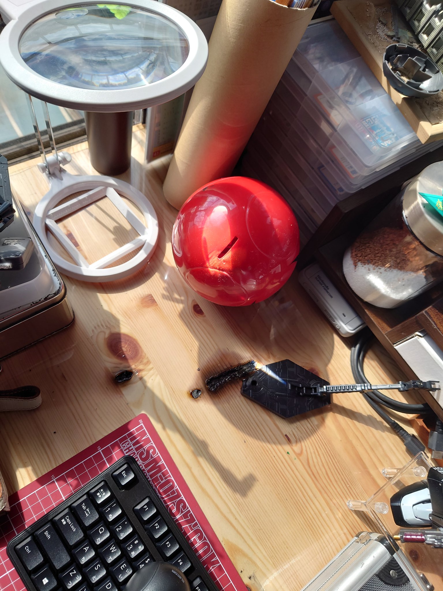 朝言ったけど、昨日は自分の不注意ですべてを失う所でした。朝、机周りを片付けして写真のルーペを置きっぱなしにして奥さんと買い物して小一時間後に帰ってきたら家の中がくさかったのね…虫眼鏡と一緒よね…部屋に煙充満して小さい🔥が出て机、プラモ溶かして…帰るの遅かったらヤバかった https://t.co/H7wYqPgiS0